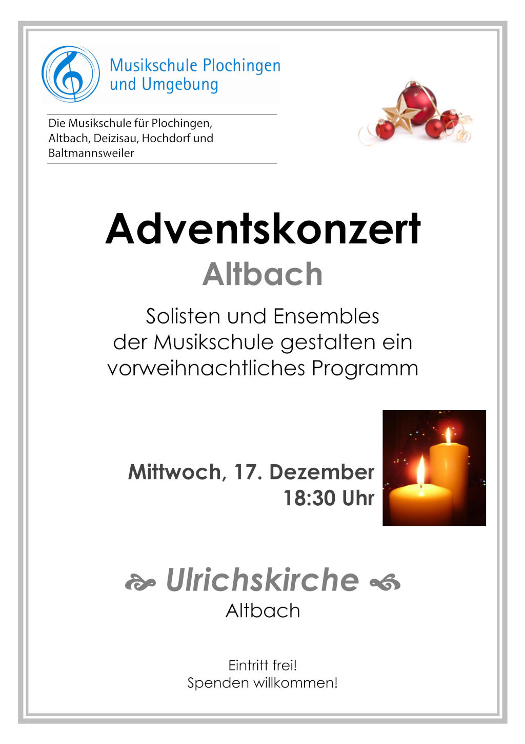 Adventskonzert Datum 17. Dezember 2025 Uhrzeit 18:30 Veranstaltungsort Ulrichskirche Altbach Hofstraße, 73776 Altbach Veranstalter Musikschule Plochingen Telefon 07153/898592 E-Mail info@musikschule-plochingen.de Website http://www.musikschule-plochingen.de Teile diese Veranstaltung